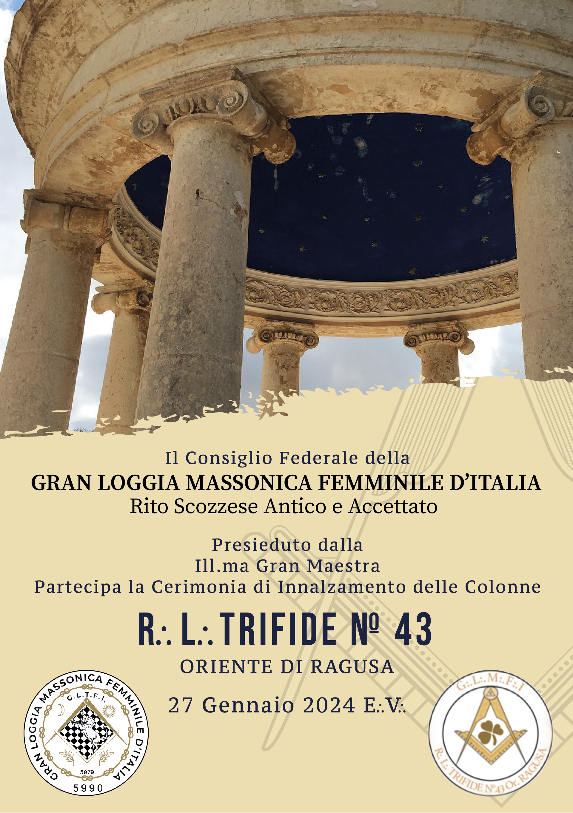 Oggi il Consiglio Federale della Gran Loggia Massonica Femminile d’Italia è lieto di annunciare l’innalzamento delle Colonne della R:.L:. Trifide n° 43 all’Or:. di Ragusa.